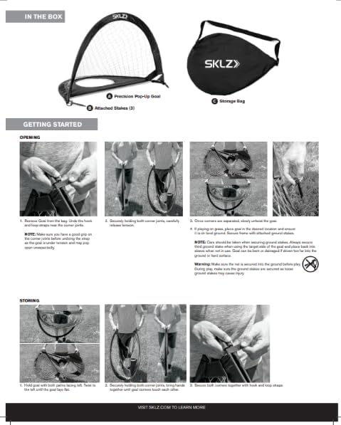 - Easy pop-up and twist-close frame for quick set up and breakdown anywhere; attached stakes hold the goal firmly in the grass.