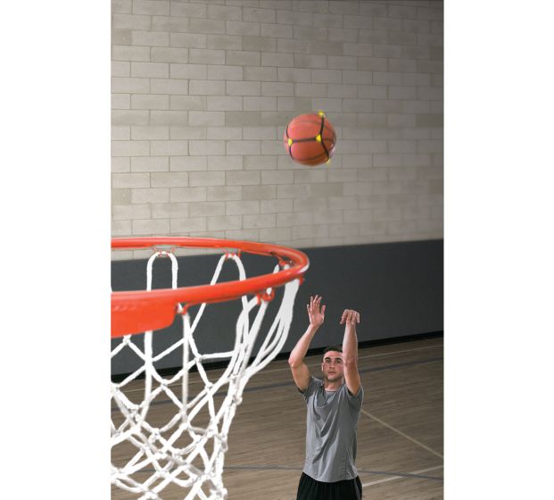Improve shooting technique with this visual aid that fits on official size basketballs. The yellow triangles on the silicone strap provide visual references for ball rotation and the shooter's alignment to the hoop. It also encourages proper hand placement while shooting.