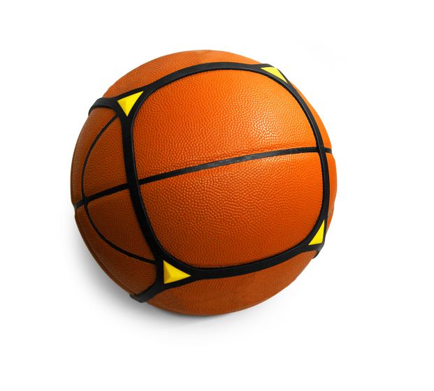 - Yellow triangles offer visual reference for ball rotation and shooter’s alignment to the basketball hoop.